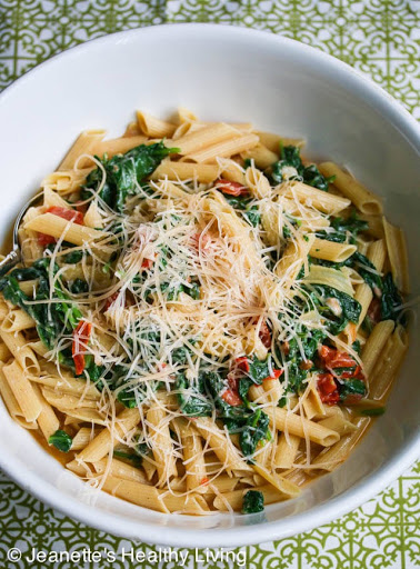 Cook pasta according to directions. Drain, reserving 1 cup pasta cooking water. Meanwhile, warm olive oil in large skillet over medium heat. Add garlic and sauce until fragrant; add spinach and tomatoes and cook until spinach just wilts, about 2-3 minutes. Add cooked pasta and toss. Add cheese, salt and pepper. Toss well. Add pasta cooking water as needed to loosen up pasta.