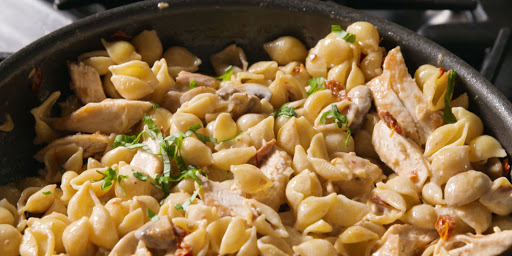 Add butter and garlic to pan and cook for about 1 minute; add mushrooms. Season to taste with salt and pepper, and cook until mushrooms are tender and slightly golden-brown. Deglaze the pan with wine. Let simmer to reduce slightly, then add chicken stock, cream, parmesan, and sun-dried tomatoes. Let simmer to thicken slightly, about 2 to 3 minutes. Stir in cooked pasta, garnish with basil and season to taste with more salt and pepper.