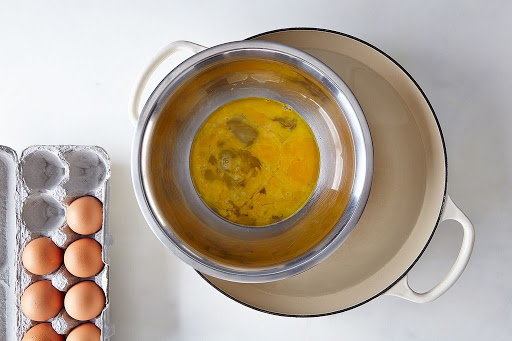 If the eggs will be used whole, simply break them into a stainless steel bowl. Stainless steel warms up faster than glass when you set the bowl in the warm water and does not retain heat as long as glass after it is removed, so the bowl does not continue to warm the eggs once you’ve taken it from the water. It’s all about control!