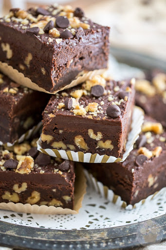 When the brownies are fully cooled, frost them with the icing and then sprinkle with a little bit of extra chopped walnuts and chocolate chips, if desired.