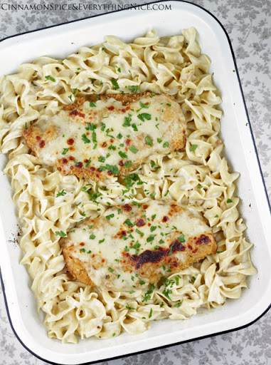 Oven fried chicken cutlets smothered in swiss cheese and served over egg noodles in a rich, cheesy sauce. Decadent and delicious.