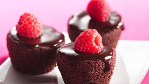 Spoon about 1 teaspoon chocolate mixture onto each brownie. Garnish with fresh raspberries.