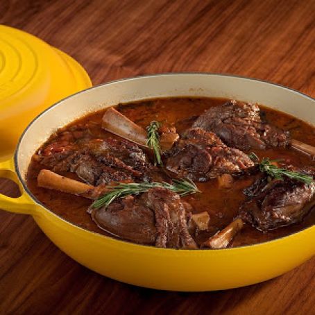 Your Le Creuset cookware gives you two options: cook on the range top or cook in the oven. Whatever method you choose, cook, covered, at a simmer until the meat is tender, about 2 1/2 hours. If you chose the oven method return the pan to the stovetop, remove the cover and increase the heat to medium-high. Cook until the liquid begins to thicken, 20 - 30 minutes. Transfer the shanks to a serving platter and cook the liquid until thick, about 15 minutes. Season to taste with salt and pepper. Pour over the shanks and serve.