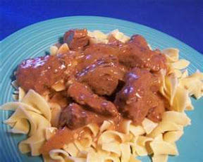 Dredge beef in flour; shake off excess. Heat shortening in large, heavy skillet over med. heat and brown beef on all sides in several batches (do not overcrowd skillet). Set aside. Pour off all but thin film of fat from skillet. Add onion & bacon and cook, stirring, for 3 min. Stir in garlic, paprika & caraway seeds and cook 30 sec. longer. Add wine, vinegar, tomato paste & meat and enough water to barely cover. Bring to gentle simmer and cook, partly covered, 2 to 2-1/2 hrs, or until meat is tender. Skim off fat and season to taste. Serve over buttered noodles with dollops of sour cream.