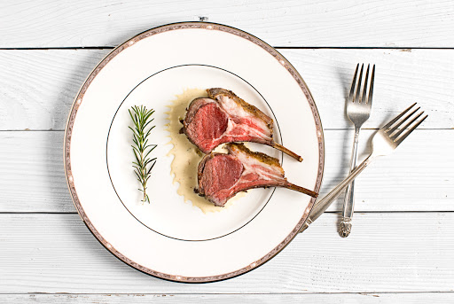 5. Cut racks between bones. Place a pool of sauce on each of 4 dinner plates. To serve, fan a half a rack of lamb (4 chops) atop each pool of sauce.