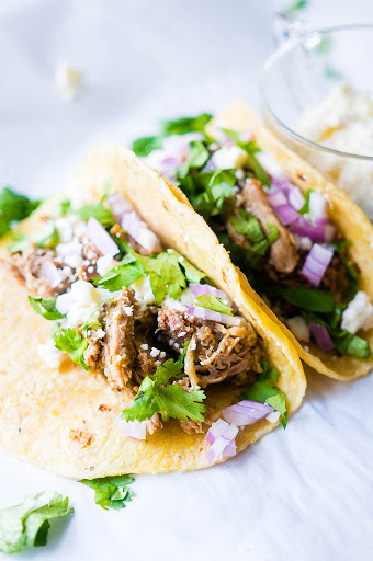 Stir to combine and then serve in tortillas topped with crumbled queso fresco, red onion, and cilantro.
