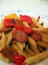 Cut sausages into 1" pieces (easiest when slightly frozen) and saute in oil until browned. Add onions and garlic and cook about 3 min. Add sliced (or cubed) peppers on top and cover. Lower heat and simmer at least 45 min. Serve over pasta