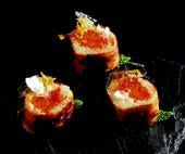 5. Scatter a little grapefruit rind and Maldon salt over the maki. Add a few drops of ginger oil and a piece of neutral caramel.
