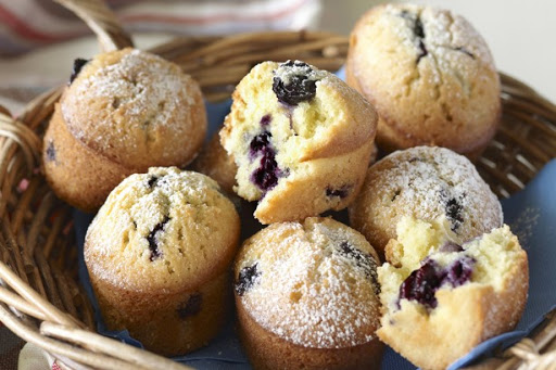Add the egg whites and butter to the dry ingredients and stir until just combined; do not overbeat. Fold through blueberries.