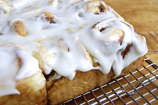 Remove the rolls from the oven, and turn them out of the pan onto a rack. Spread them with the icing; it'll partially melt into the rolls.