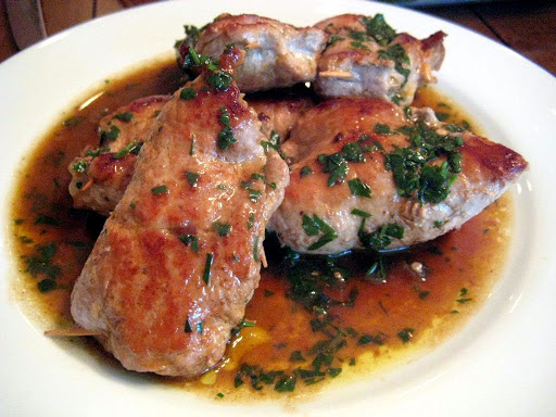 Heat 4 tablespoons extra-virgin olive oil in another saute pan. Place the pork pockets in the pan and cook until golden brown on both sides. Add the wine, lower the heat and simmer 10 minutes. Remove the pork to a plate, swirl some more olive oil into the pan, add chopped parsley to the liquid, pour over the pockets and serve.
