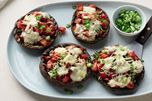 Serve this warm appetizer dish during BBQ season, or anytime you feel like grilling. Portobellos with tomatoes, green onions and a creamy herb & garlic filling are delicious as is or served over mixed greens.