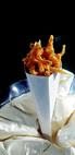 1. Fill the cornets with the fried fish and place them in a holder that allows them to be served vertically.