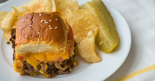 Cut dinner rolls in half horizontally and place bottoms of rolls inside greased baking dish.