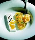 2. Break up the gelatin and mix with the deconstituted ugli and spread down the center of the plate. Place the herbs and gingers on top of the ugli mixture.