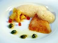 7. Heat the plate in the salamandra for 10 seconds. Put 2 soup spoonfuls of meunìere sponge on the thicker part of the skate, piling the sponge up and covering a ¼ of the skate.
