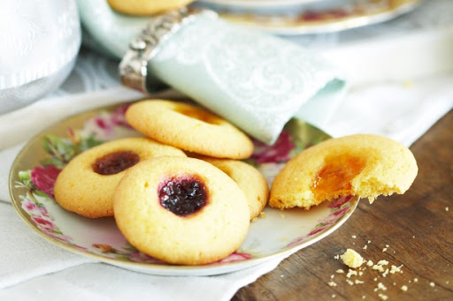 Use lightly floured hands to roll 1 1/2 teaspoons of mixture into small balls. Place on the lined trays, allowing room for spreading. Use a lightly floured finger or the end of a wooden spoon to make an indentation in the centre of each ball. Spoon 1/2 teaspoon of jam into the centre of each biscuit.