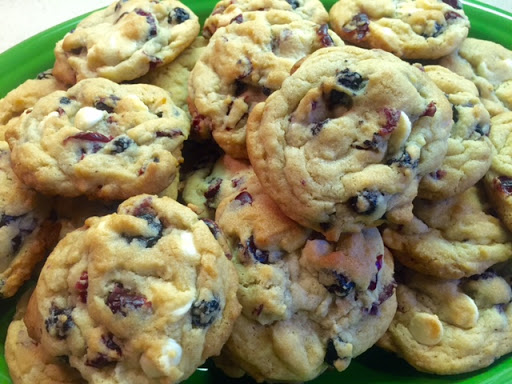 Preheat oven to 375. In a medium bowl, combine the flour, baking powder, baking soda, & salt. In a stand mixer, cream together the butter & sugars. Add vanilla & egg. Add flour mixture a little bit at a time. Fold in the dried berries & white chocolate chips. I actually use the mixer on the lowest setting to help with this process because the dough can be hard to stir. Using a cookie scoop, drop dough onto a parchment-lined or silicone-lined cookie sheet. Bake for 10 minutes. Let cool for 2 minutes, then transfer to a wire rack.