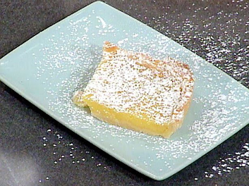 When the crust is golden brown, remove it from the oven and reduce the oven temperature to 325 degrees F. Stir the lemon mixture again, then pour onto the warm crust. Bake until the filling is set, about 20 minutes. Transfer to a wire rack to cool completely. Grasp the waxed paper that lines the 2 longest sides of the baking dish and remove the bars from the pan by pulling up gently. The entire dessert should easily dislodge and come away from the pan. Transfer to a cutting board and, using a clean knife, cut into squares, wiping knife after each cut. Place a small amount of confectioners' sugar into a small sieve, and sprinkle the bars with the sugar. Serve immediately, or refrigerate, wrapped with plastic wrap, up to 2 days, until ready to serve.