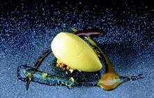3. Place a quenelle of smoked corn sorbet on the lemon gelatin and fried corn.