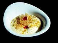 2. Just before serving, place the almond ice cream beside the praline and cover the almond praline with the hot vanilla foam.