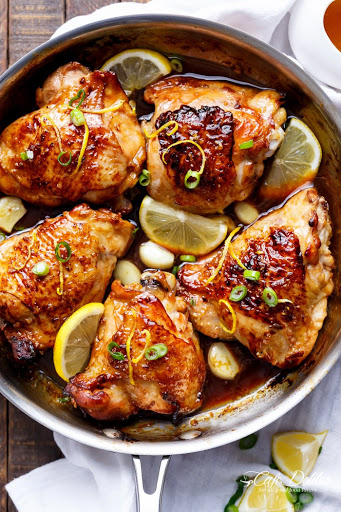 Honey Lemon Garlic Chicken with a crispy skin and a sweet, sticky sauce made up of ingredients you have in your kitchen cupboard!