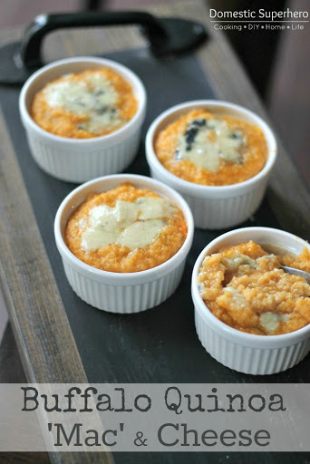 3. Remove the pan from the heat then add in buffalo sauce and cheddar cheese. Season with a few dashes of salt and pepper. Stir until the cheese is completely melted then add in cooked quinoa, and stir to combine.