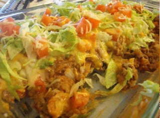 Layer ingredients in 9 x 13 pan as listed - crushed chips, seasoned meat and 2/3 of cheese.