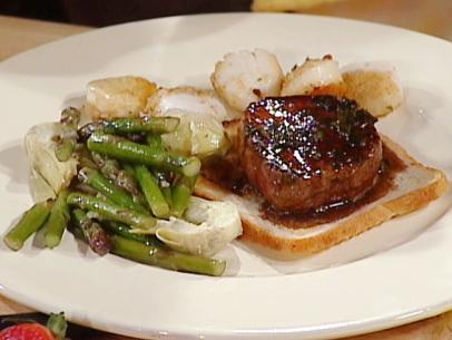 Baked Scallops and Seared Tournedos with Artichoke Hearts and Asparagus Tips