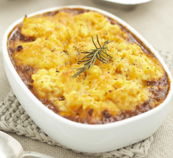 10 Spread mashed potatoes over the meat so that the meat is completely covered. Sprinkle the remaining cheese over the potatoes and bake in 350° oven, uncovered for 35 minutes.