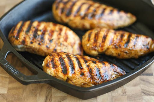 •Preheat grill to medium high heat. Add chicken to grill and cook, flipping once and basting with reserved 1/4 cup marinade until cooked through, about 5-6 minutes on each side.