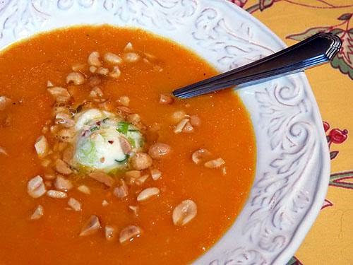 5. Ladle soup into bowls. Top with small spoonful of chile butter; sprinkle with nuts