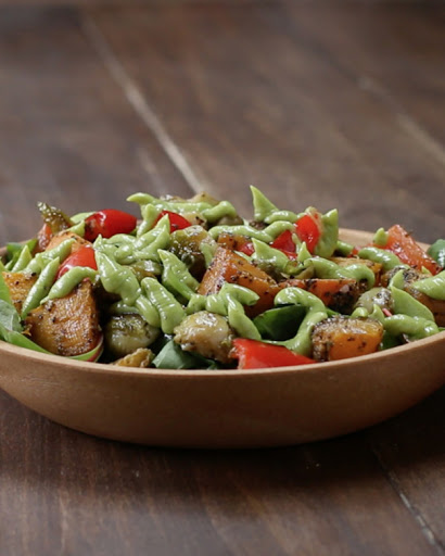 5. To assemble the salad, place a handful of mixed greens on a plate and top with the roasted veggies. Spoon on the Avocado Dressing and serve!