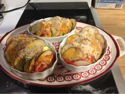 Slice in food processor: potatoes, tomatoes, onion, zucchini