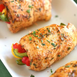 Once chicken has marinated, evenly place 6 bell pepper slices in the middle of the chicken cutlet, roll up and secure with a toothpick. Repeat this step until all the cutlets have been rolled up and place seam side down in a prepared baking dish.