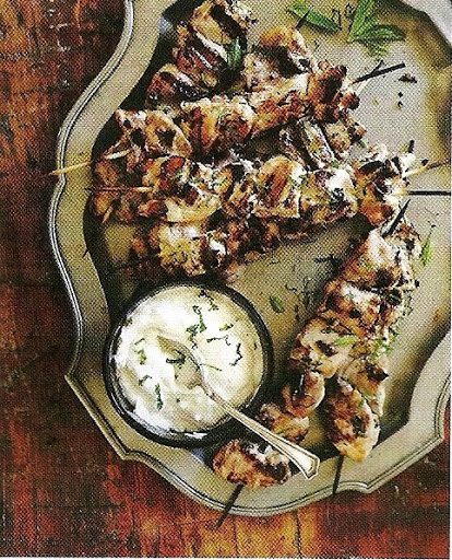 2. Soak 16 bambooo skewers in cold water for about 30 minutes. Preheat barbecue to high. Thread 6 to 8 chicken pieces onto each skewer, squeezing close together. Sprinkle generously with salt. Grease the hot grill with oil, place skewers on it and reduce heat to medium-low. Close lid and cook 15 to 20 minutes, turning once or twice, or until cooked through. Sprinkle with mint and serve with Grilled Flatbreads, Romaine Salad with Grilled-Lemon Vinaigrette and tzatziki.