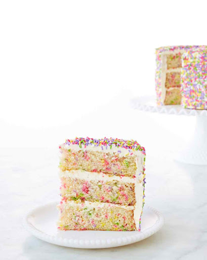 This colorful, whimsical vanilla cake has sprinkles inside and out, and just may be the ultimate birthday cake. This recipe is adapted from the book, “Baked Occasions” by Matt Lewis and Renato Poliafito. Martha Stewart prepared this cake on Martha Bakes.