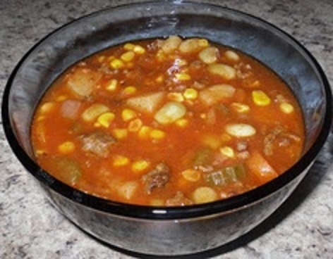 Brown beef and drain. Mix all ingredients together and bring to a boil. Reduce heat and simmer 1-1.5 hours.