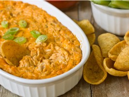 Preheat oven to 350 degrees F. Add the cooked chicken, cream cheese, shredded cheeses, ranch dressing powder, and hot sauce in the bowl of a stand mixer fitted with the beater blade (this can also be done by hand) and mix on low until combined. Spread into a medium baking dish and cook until warm and bubbly, 25 to 30 minutes. Serve with corn chips, such as Fritos, and celery sticks.