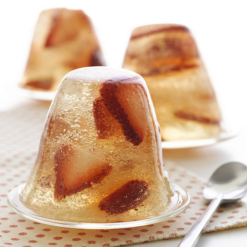 Transfer the gelatin mixture to a bowl, add the sugar, and stir until dissolved. Stir in the champagne and ginger ale. Refrigerate until thickened (see page 9). Fold in the strawberries and spoon into 7 to 10 individual molds or a 7-cup mold. Refrigerate until firm (see page 9). Unmold and serve.