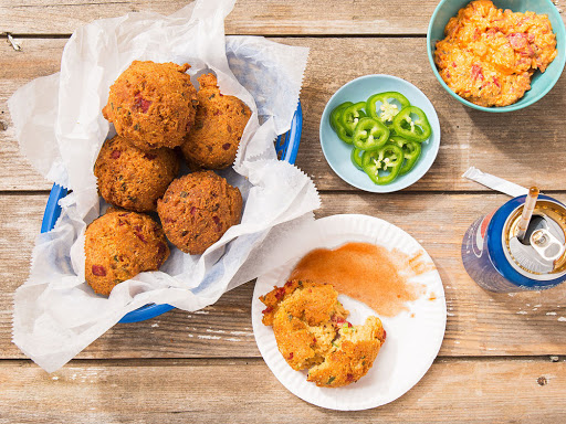 Add the canola oil to a large heavy-bottomed pot or Dutch oven and preheat to 350° using a deep-fat thermometer. Scoop 2-tablespoon balls of the batter into the oil a few at a time. Fry, turning occasionally as needed with a slotted spoon, until golden brown on the outside and just cooked through, about 3 minutes. Remove with a slotted spoon and drain on paper towels. Serve warm, with the extra pimento cheese for dipping.