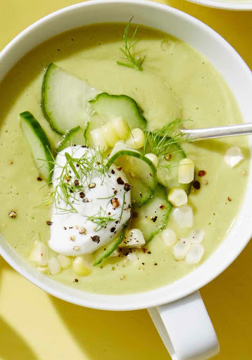 Corn and Avocado Soup with Pickled Cucumbers Recipe