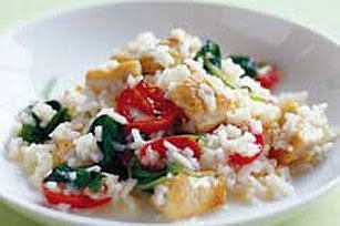 ADD spinach, rice, tomatoes, broth and water; mix well. Bring to boil. Reduce heat to low; cover. Simmer 5 min., stirring occasionally.