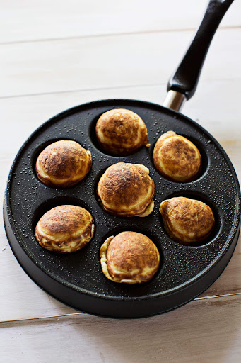 Heat your pancake puff pan over low/medium heat. Once warmed gently, spray with nonstick cooking spray (I hold my pan over the sink as I do this so any excess can roll off), and fill each hole with one tablespoon of batter. Then add a teaspoon of filling and cover with just a bit more batter (about 1/2 tablespoon or a little less). Allow to cook for a couple minutes, then use a small wooden chopstick or the end of a wooden spoon to gently flip each pancake puff. If you've never made these before, this is honestly just as easy as flipping a pancake – might take you a time or two to get the hang of it, but it's an imprecise and easy thing to do once you try. :) Do use a wooden chopstick or other small wooden stick to turn these so you don't scrape the coating of the pan in the process. Once flipped, allow each puff to cook for another couple of minutes. After your first batch, check one to make sure they are cooking through all the way and adjust your heat if needed before starting the next batch.