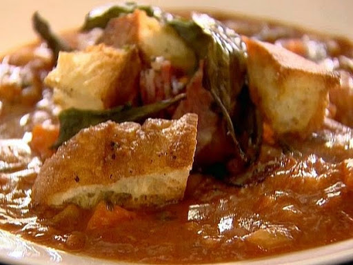 For the topping, place the ciabatta cubes, pancetta, and basil on a sheet pan large enough to hold them in a single layer. Drizzle with olive oil, sprinkle with salt and pepper, and toss well. Cook, stirring occasionally, for 20 to 25 minutes, until all the ingredients are crisp. The basil leaves will turn dark and crisp, which is perfectly fine. Reheat the soup, if necessary, beat with a wire whisk until the bread is broken up. Stir in the Parmesan and taste for seasoning. Serve hot sprinkled with the topping and drizzled with additional olive oil.