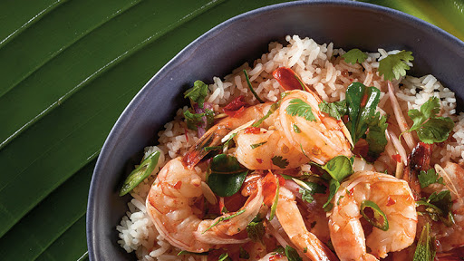Add the shrimp to the sauce while still warm and toss; the lime will continue to “cook” the shrimp like a ceviche. Add the lemongrass, shallot, cilantro, mint leaves and kaffir lime leaves, reserving a little of each herb for garnish. Toss, and place on a dish; scatter the reserved herbs on top. Serve immediately with hot rice.
