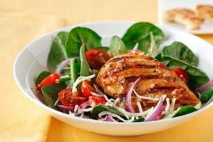 MIX tomatoes, cheese and basil; set aside. Toss spinach and onions with remaining 2 Tbsp. dressing; spoon onto serving plate. Top with cooked chicken and the tomato mixture. Serve with the bread.