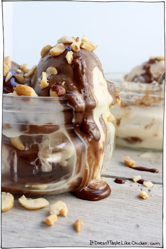 Assemble your sundae by scooping the cashewmilk frozen treat, drizzling the warm fudge sauce overtop and finish by sprinkling chopped peanuts. Bon Appetegan!