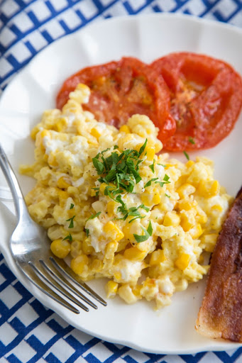 Scrambled Eggs with Corn, Goat Cheese and Roasted Tomatoes
