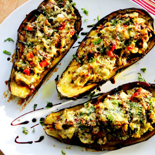 Pile high the mixture into the scooped out portion of the eggplant and place back into the 400 oven until ricotta is heated through, about 15 minutes.